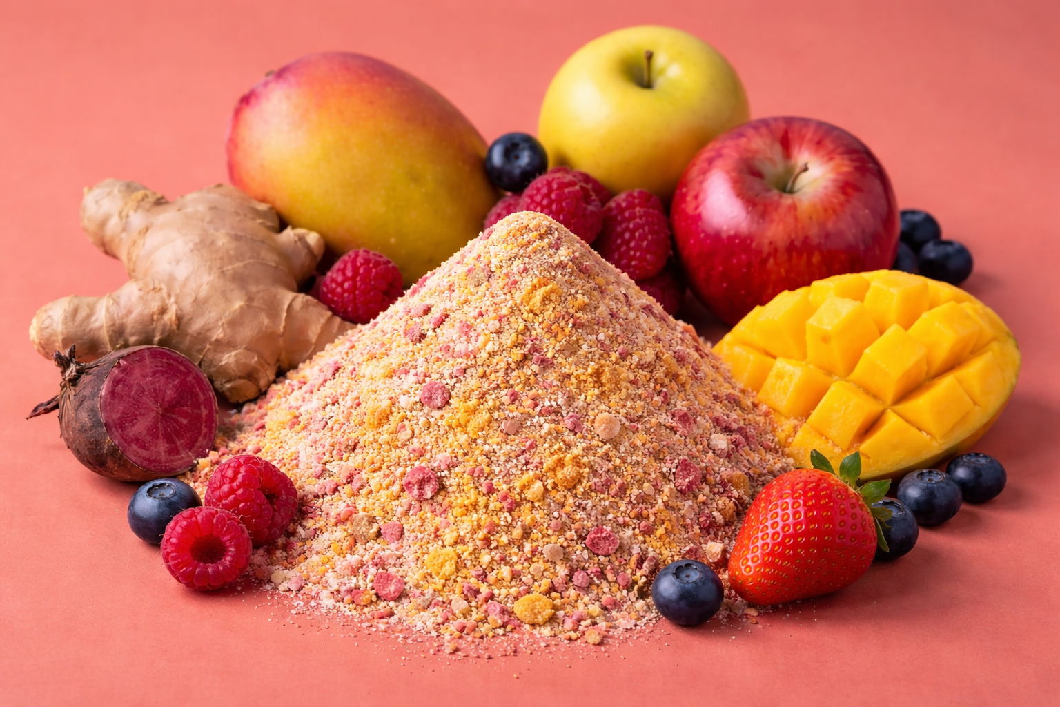 Ingrediënten: gember (33%), mango (23%), aardbei (15%), framboos (15%), biet (5%), acerola (5%), wilde bosbes (2%), appel (2%)