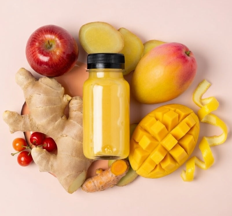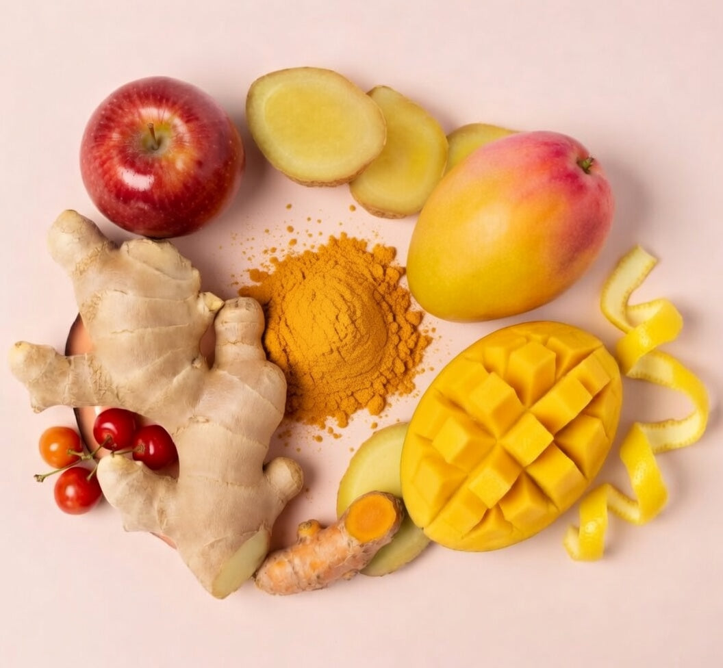Ingrediënten: Gember (50%), Mango (25%), Appel (16%), Acerola (5%), Kurkuma (3%), Citroenschil (1%)